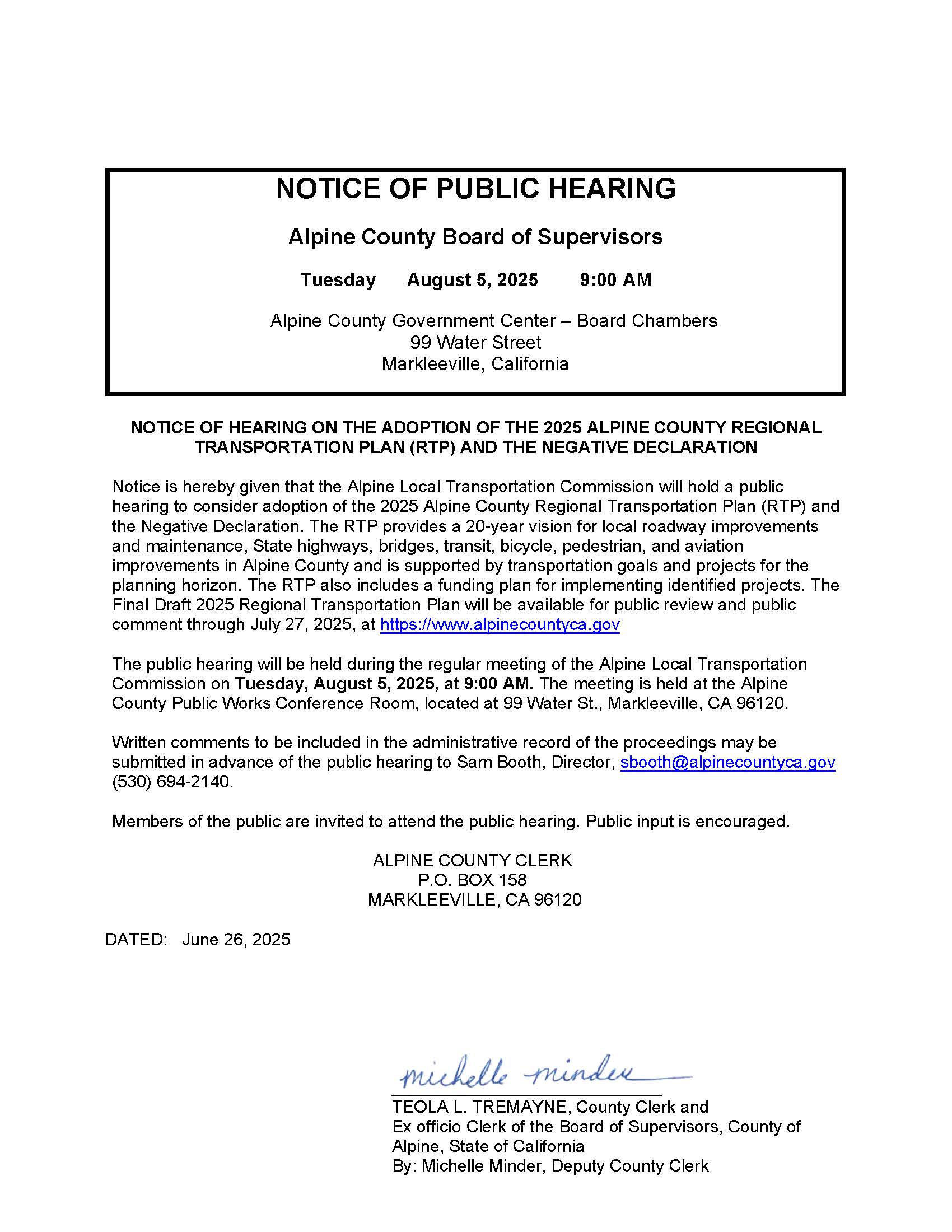 Notice is hereby given that the Alpine Local Transportation Commission will hold a public hearing to consider adoption of the 2025 Alpine County Regional Transportation Plan (RTP) and the Negative Declaration. The RTP provides a 20-year vision for local roadway improvements and maintenance, State highways, bridges, transit, bicycle, pedestrian, and aviation improvements in Alpine County and is supported by transportation goals and projects for the planning horizon. The RTP also includes a funding plan for implementing identified projects. The Final Draft 2025 Regional Transportation Plan will be available for public review and public comment through July 27, 2025, at https://www.alpinecountyca.gov