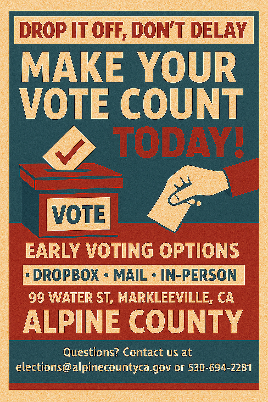 Don't Let Your Ballot Miss the Party — Turn It In Early! Drop your ballot off early — by dropbox, mail, or in person — and make your vote count today!